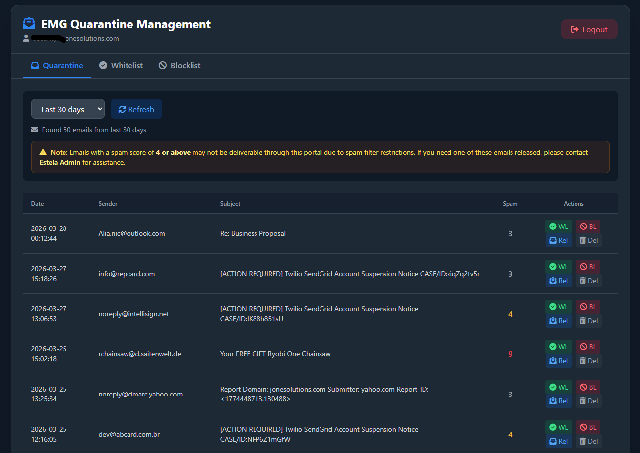 Easily release, block, or whitelist emails with our custom EMG Quarantine Management.
